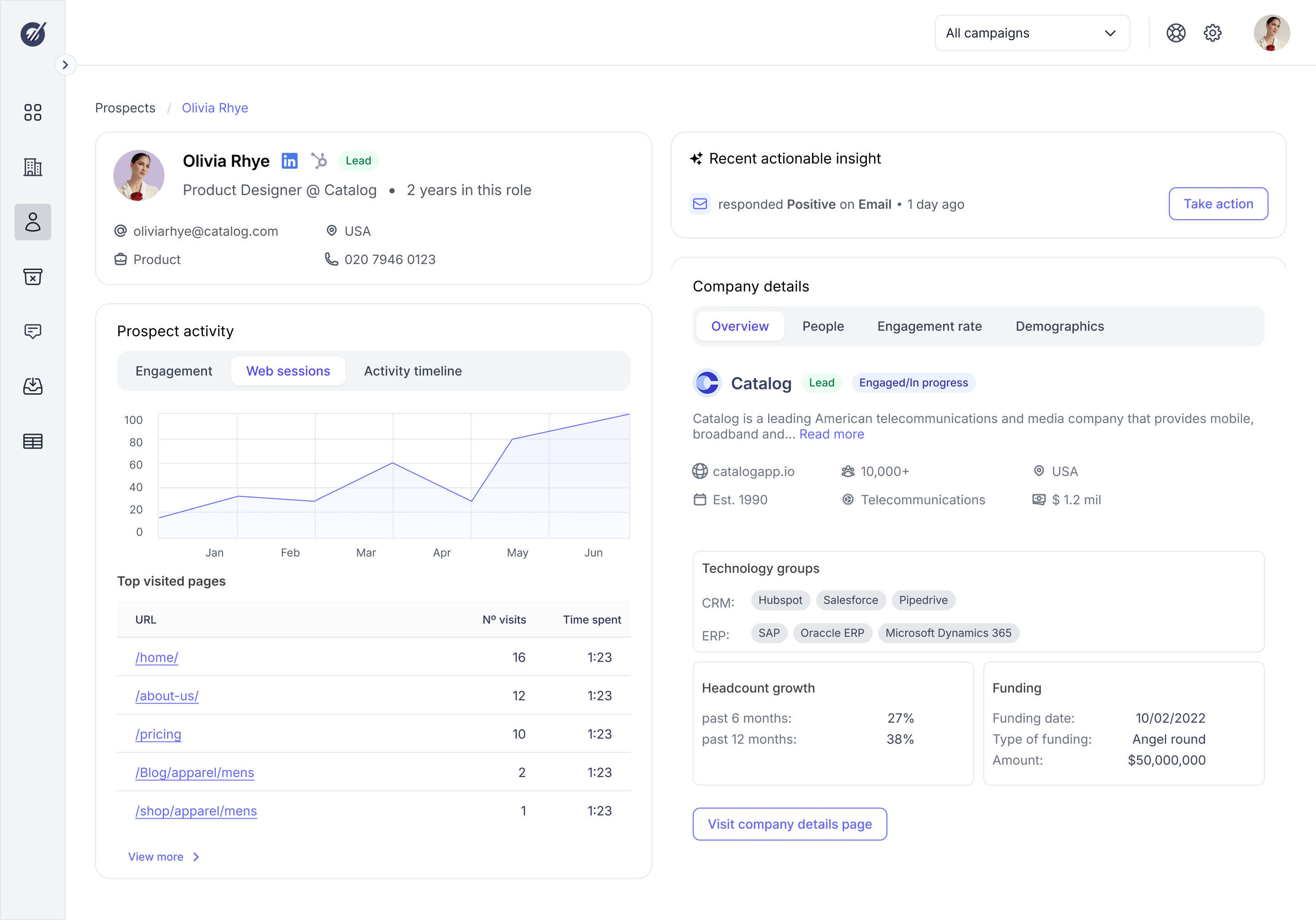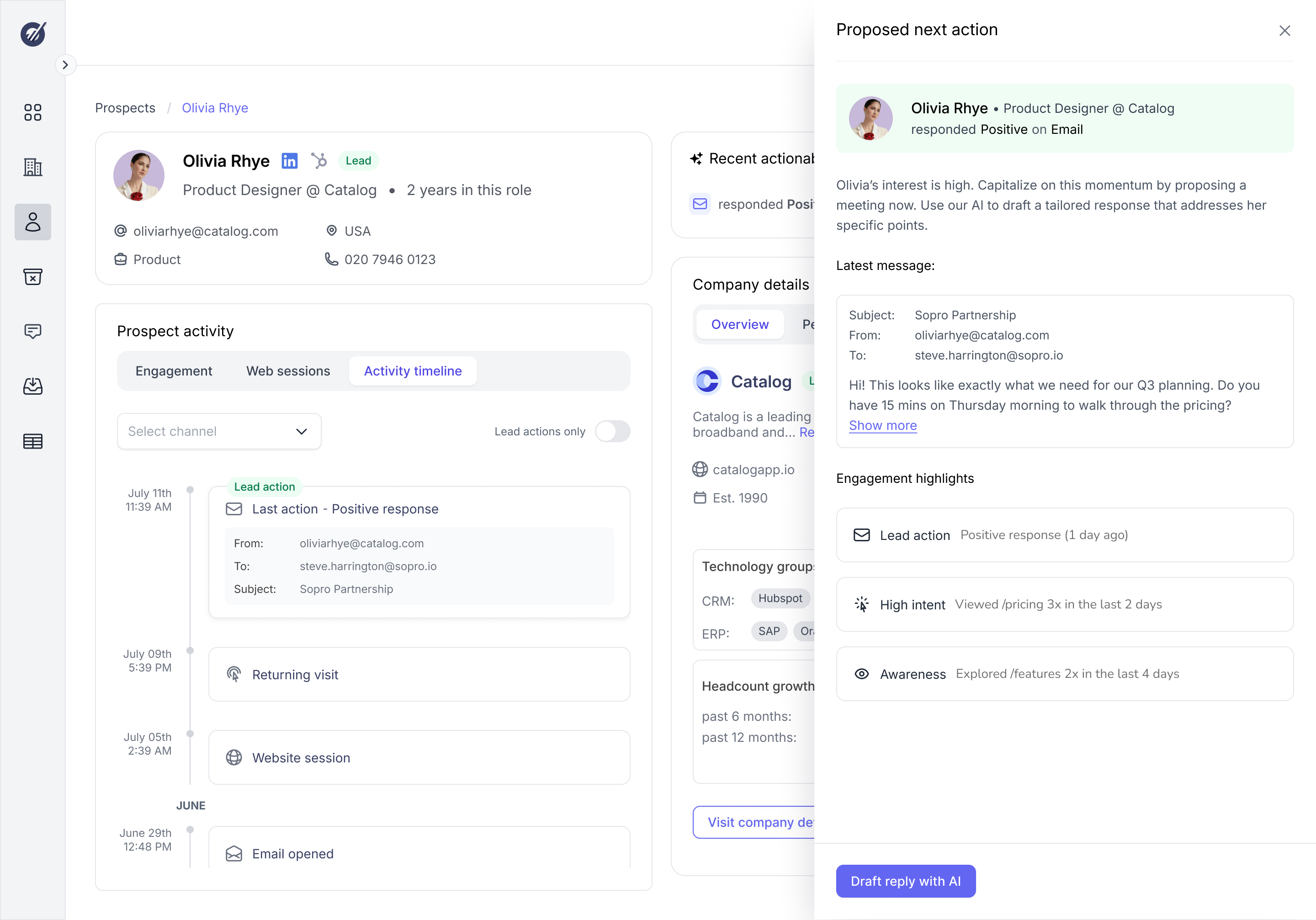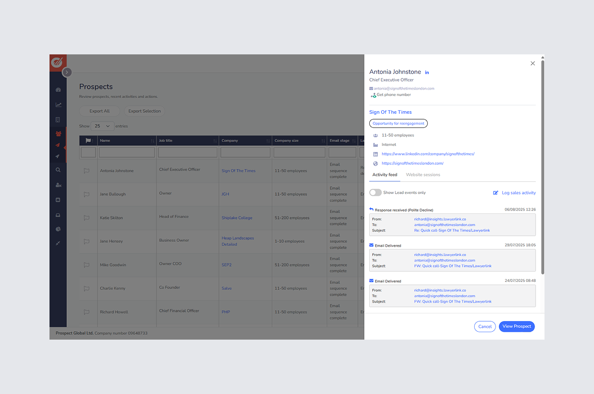 We redesigned the Prospect and Company experience to function as a kind of sales intelligence dashboard. By prioritizing the surfacing of latent data, we moved away from the redundant workflows in favor of a holistic, information-rich dashboard.