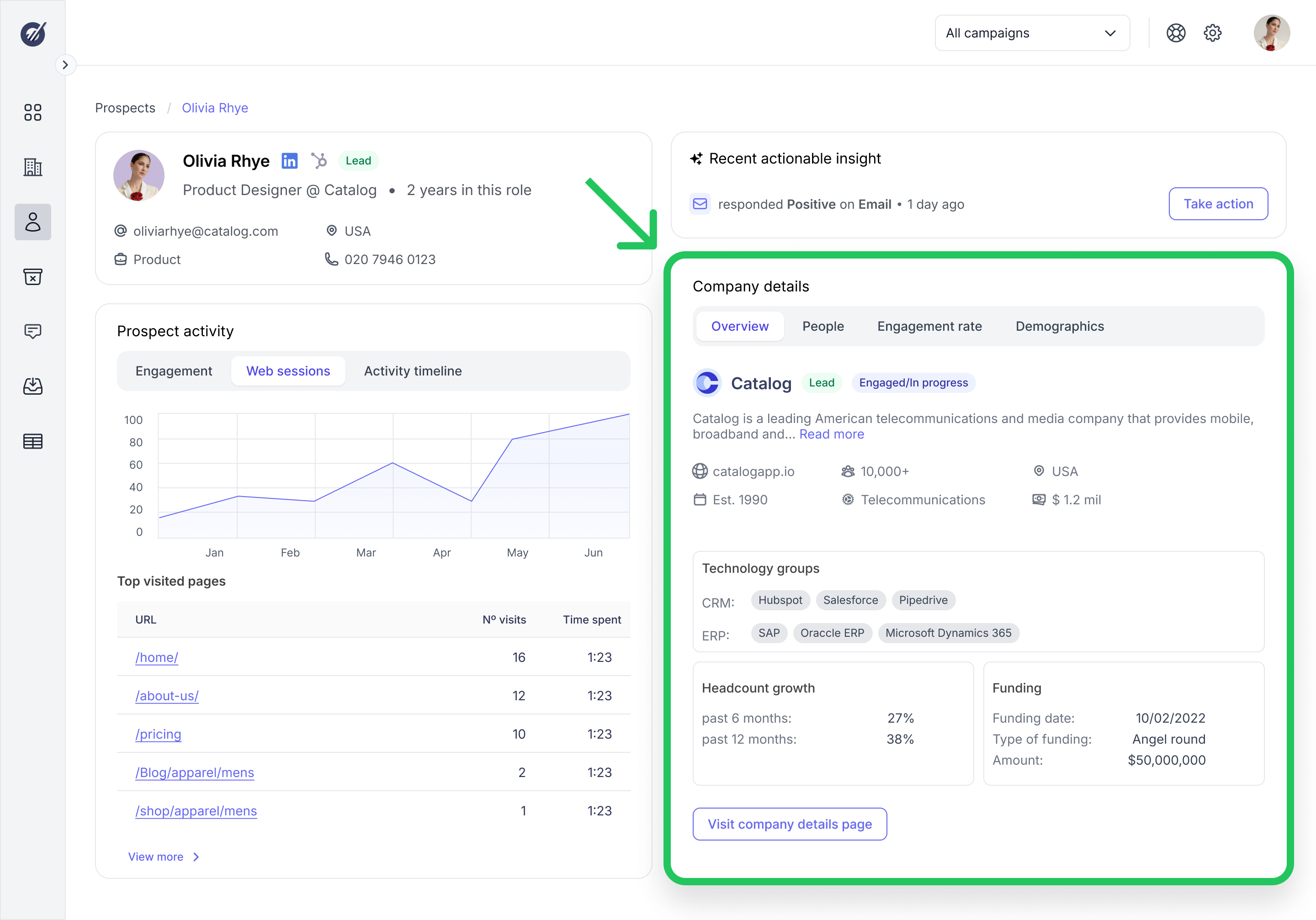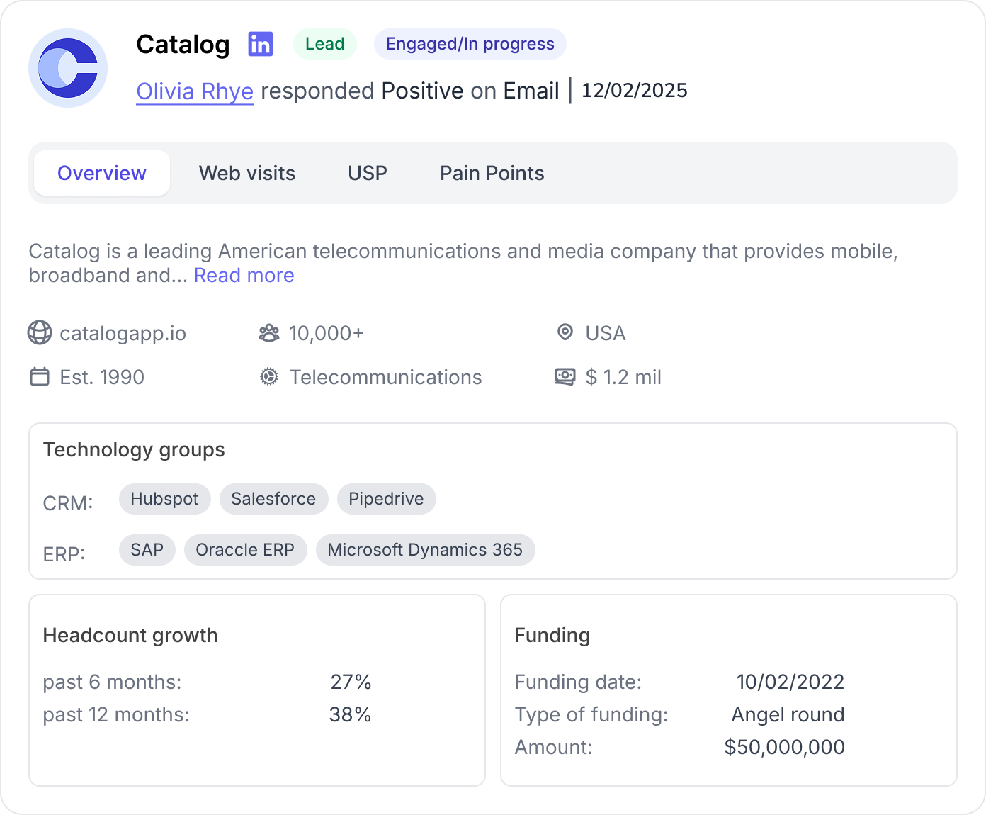 To solve the navigational friction between Prospects and Companies interfaces, we integrated a dedicated Company Overview section directly into the Prospect Detail view. This solution follows a progressive disclosure strategy: